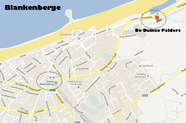 From Blankenberge railway station, take the coast tram towards Knokke, and get out at “Corsendonk de Duinse Polders”: http://www.delijn.be. There is a tram every 10-15 minutes.